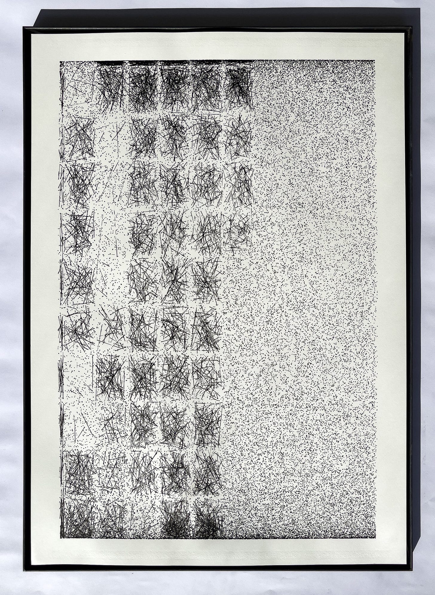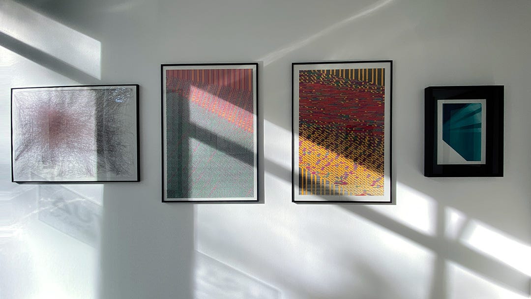 In this exhibition, we are exposing plots from the past two years. About 14 pieces from various series, Composition #65, #73, #69, #79, #80, Upward Spiral, One day of honest work, and Buffer Overflow. About 15 pieces together.