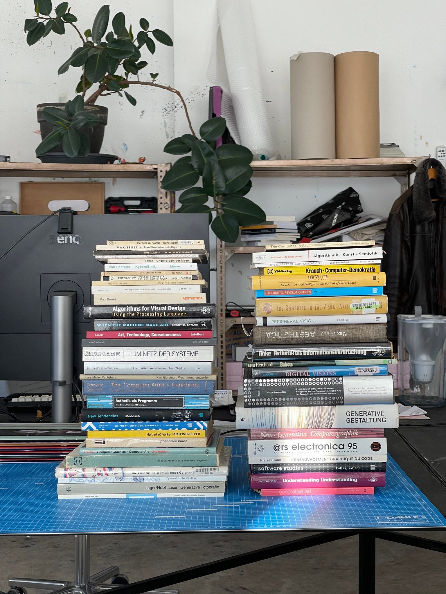 I have collected many books in the past as well, from various pioneers like Franke, Frieder Nake, Manfred Mohr, Vera Molnar, Harold Cohen, Goodman, Max Bense, Heinz von Foerster, and many other computer art books, e.g., '95 Ars electronica catalogs. These and more are a huge influence.